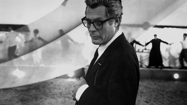 Marcello Mastroianni plays Guido Anselmi, a director whose new project is collapsing around him, along with his life. One of the greatest films about film ever made, Federico Fellini's 8 1/2 (Otto e mezzo) turns one man's artistic crisis into a grand epic of the cinema. An early working title for 8 1/2 was The Beautiful Confusion, and Fellini's masterpiece is exactly that: a shimmering dream, a circus, and a magic act.